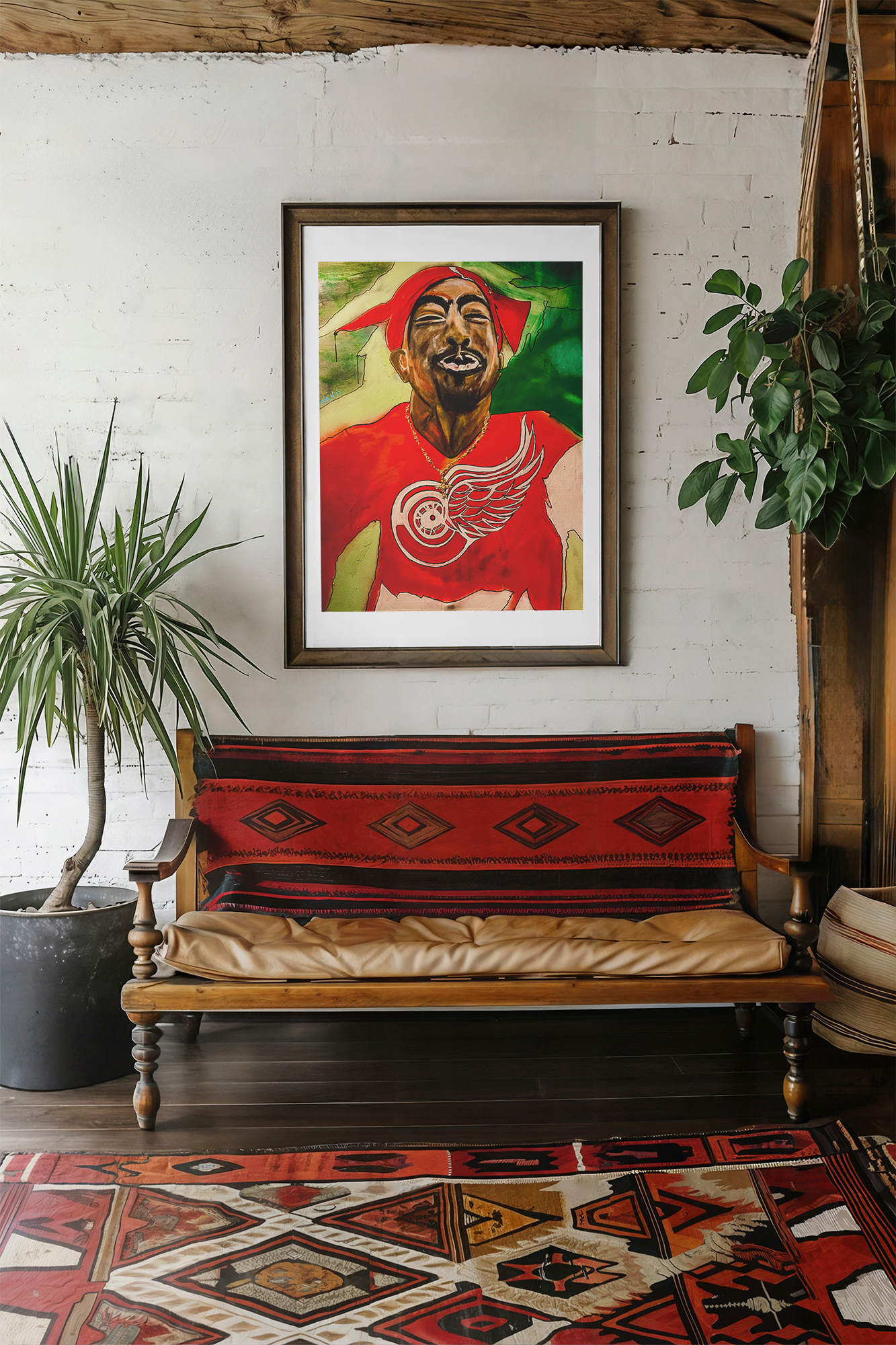 This vibrant and emotive print by Brady Matthews captures the legendary rapper 2Pac, donned in a Detroit Red Wings jersey, symbolizing his influence and appeal across diverse cultures. The portrait features Tupac in a moment of joyful expression, enhanced by the iconic red bandana and a cross necklace, reflecting both his style and personal beliefs. The backdrop's lively green and red hues complement Tupac’s dynamic spirit and his resilience as an artist and a social advocate. This artwork celebrates Tupac's life, showcasing his enduring impact on music and culture as well as his role as a powerful voice for social change.