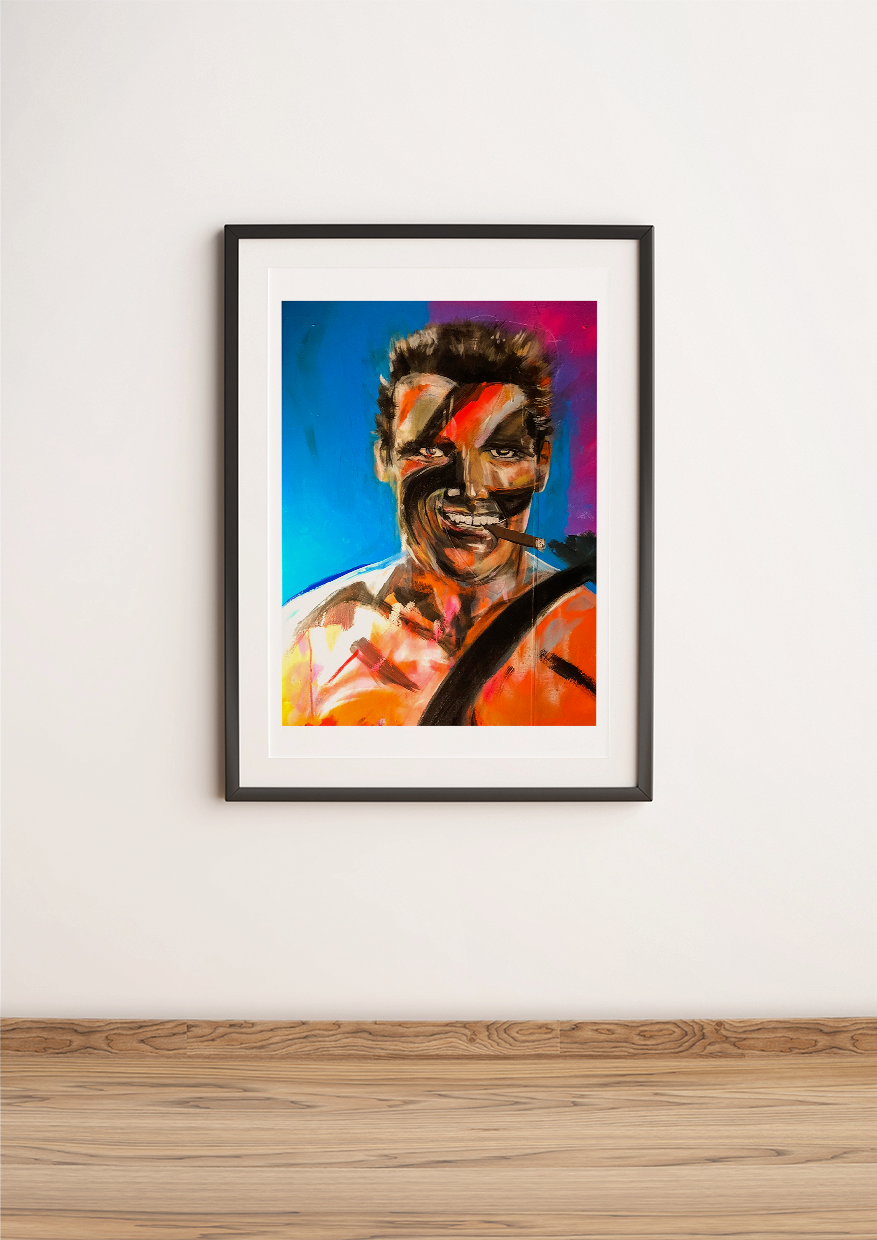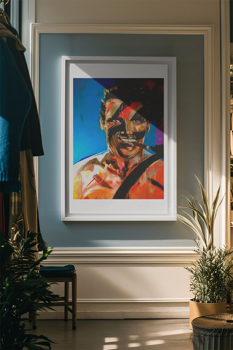 This vibrant and intense portrait of Arnold Schwarzenegger by Brady Matthews channels the unyielding spirit and iconic roles of Schwarzenegger's film career, reminiscent of his characters in classics like Commando and Predator. The painting features a dynamic composition with vivid colors and impactful strokes that highlight Schwarzenegger's powerful persona and distinctive smirk. The use of striking orange and bold blue in the background not only enhances the dramatic effect but also contrasts sharply with the figure, emphasizing his forceful presence in cinema and beyond. This piece is an exhilarating homage, capturing the essence of Schwarzenegger's impact on film and popular culture.
