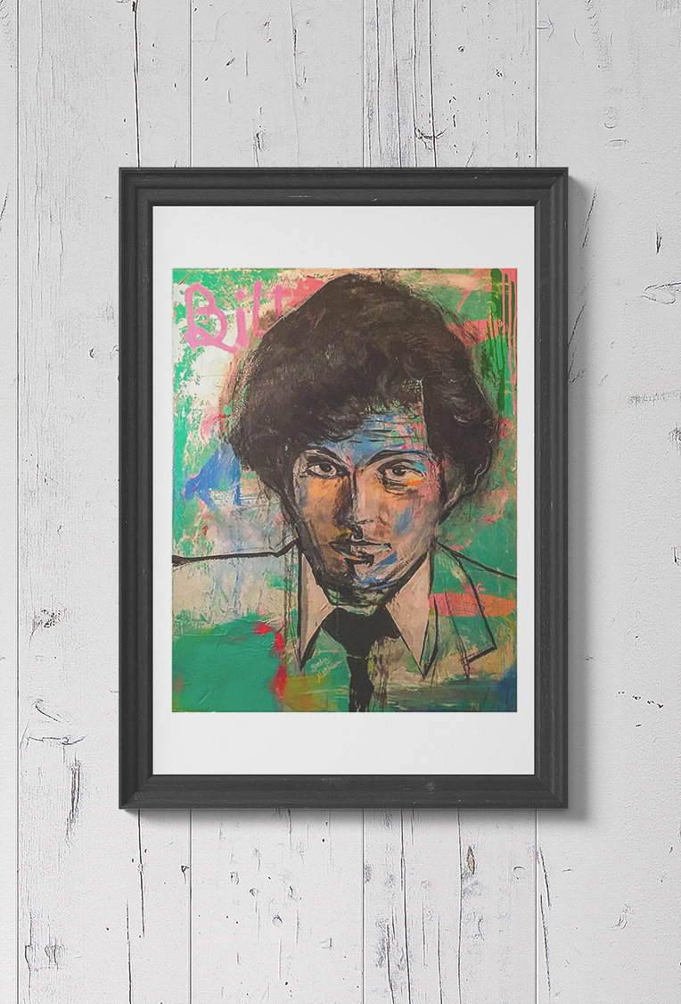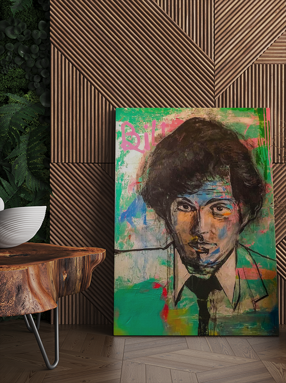 This expressive painting by Brady Matthews captures the introspective and soulful essence of Billy Joel, famously known as the "Piano Man." With a blend of abstract and realistic elements, Matthews portrays Joel in a thoughtful pose, his eyes conveying a depth of emotion that resonates with his musical legacy. The use of vibrant, contrasting colors against a textured background evokes the eclectic and dynamic nature of Joel's music career. This artwork is a visual symphony, celebrating the artist's influence on rock and pop music while offering a captivating visual experience for fans and art collectors alike.