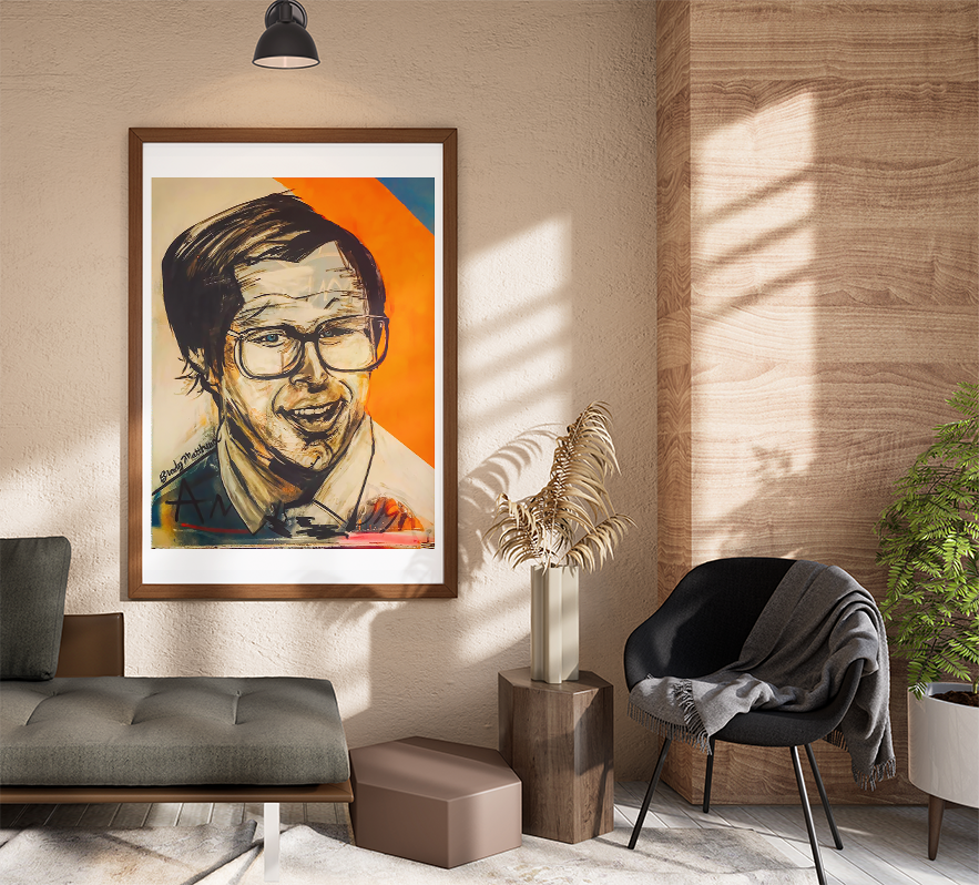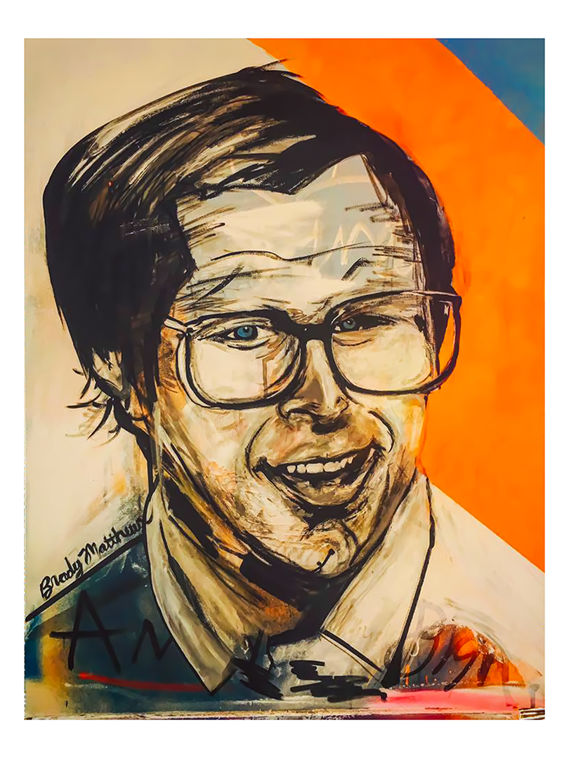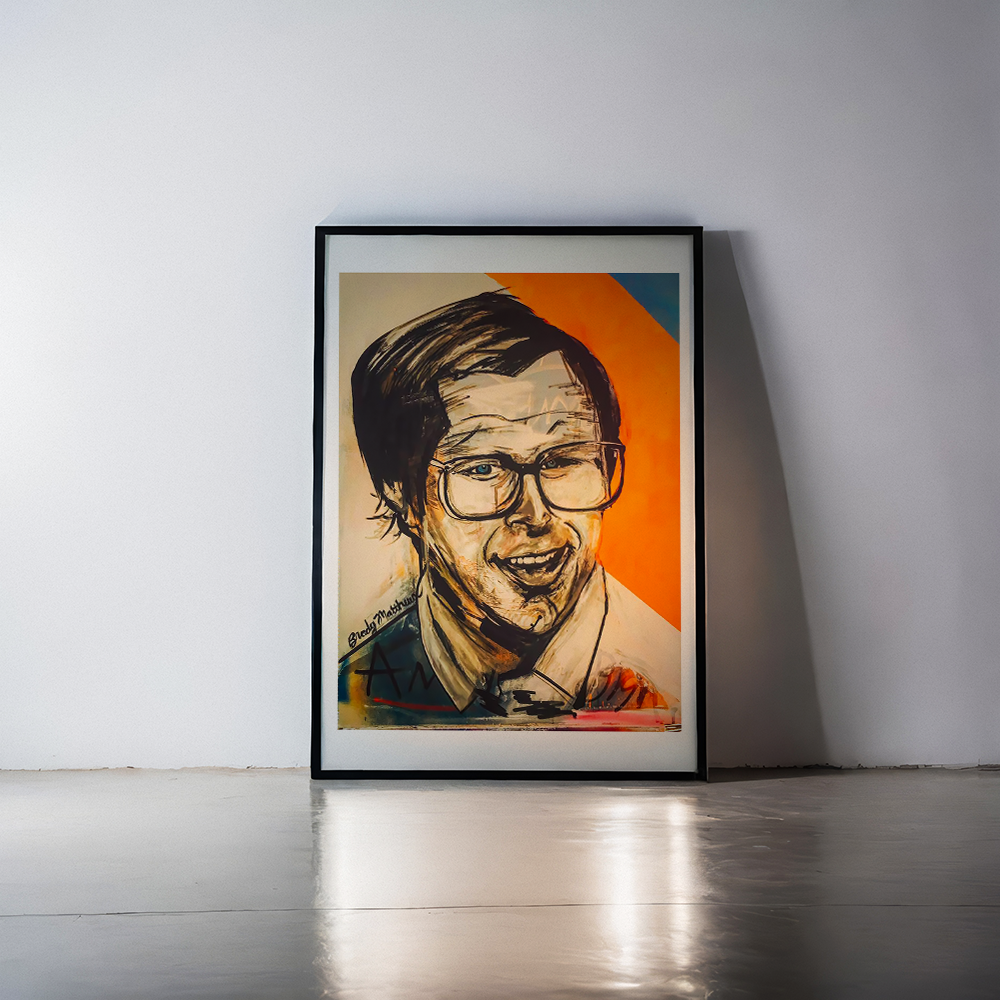 This lively portrait captures the iconic Chevy Chase in his beloved role as Irwin "Fletch" Fletcher, showcasing the characteristic wit and charm that defined the character. Painted by Brady Matthews, this piece brilliantly reflects Fletch’s mischievous smirk and clever demeanor through a vibrant palette and expressive brushwork. The bold contrast of warm oranges in the background against the detailed, lifelike depiction of Chase highlights the comedic and investigative essence of Fletch. This painting not only pays tribute to Chevy Chase's memorable performance but also resonates with fans of the classic comedy, making it a perfect addition to any collector’s gallery.