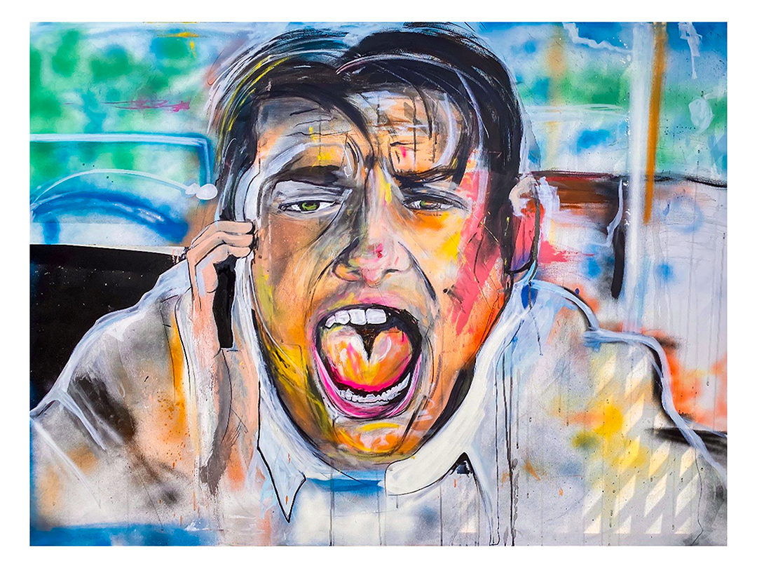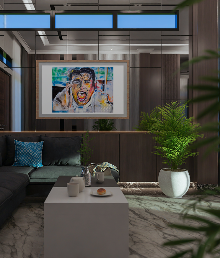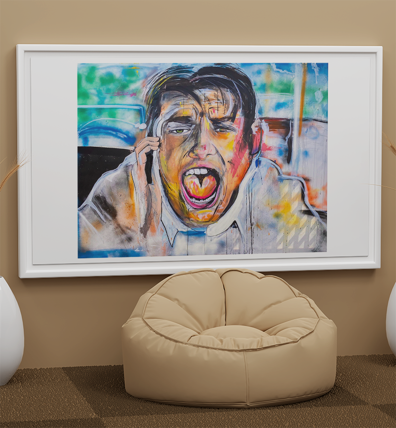 This dynamic print captures the iconic moment from "Jerry Maguire" where Tom Cruise's character passionately delivers the unforgettable line, "Show me the money." Artist Brady Matthews portrays this high-energy scene with expressive brushwork and a vibrant, chaotic background that mirrors the emotional intensity of the moment. The use of bold colors and sharp contrasts highlights Maguire's expressive face and the fervor of his plea, making this artwork not just a visual representation but an emotional echo of the film's climax. This piece is perfect for film enthusiasts and collectors who appreciate cinema's most memorable scenes.