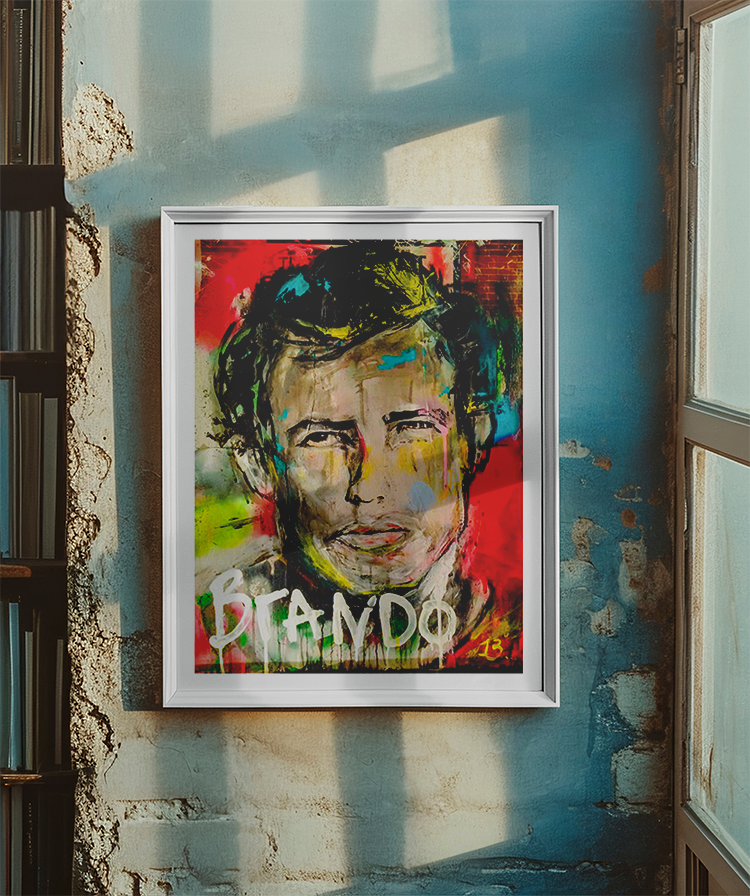 This expressive print by Brady Matthews captures the iconic intensity of Marlon Brando, one of the greatest actors of his generation. The artwork vividly portrays Brando's enigmatic gaze and chiseled features, highlighted by a dynamic and colorful backdrop that adds a modern twist to his classic appeal. The splashes of vibrant colors across the canvas evoke the emotional depth and complexity Brando brought to each of his roles, from the rebellious biker to the influential mob boss. This piece beautifully melds the old Hollywood allure with contemporary art, making it a striking tribute to Brando’s enduring legacy in cinema.